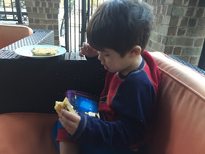 Valentine's Day weekend was extremely warm this year so Mark had his breakfast outside while enjoying his video.